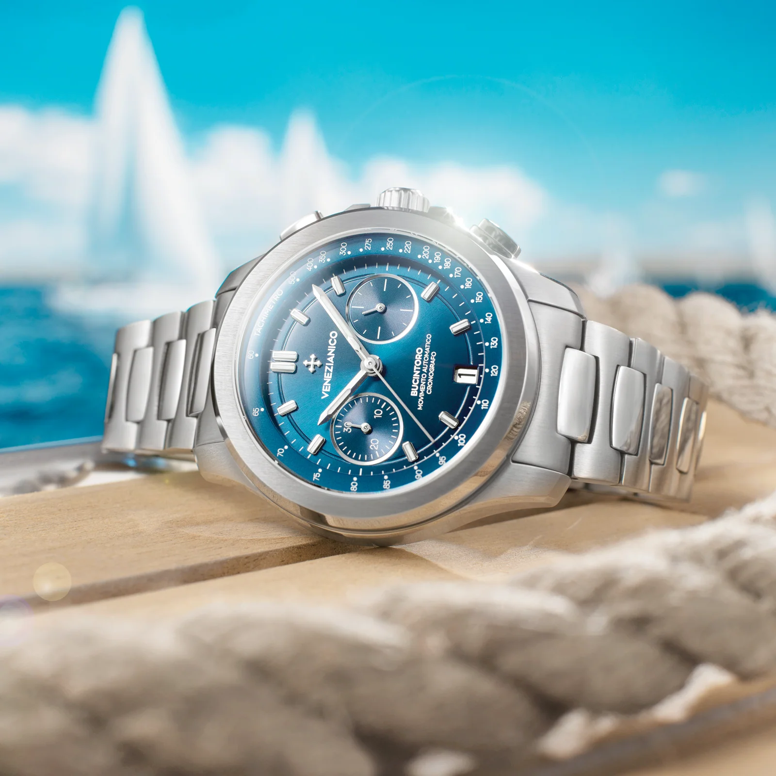 Bucintoro is our chronograph, a watch capable of measuring specific time intervals, designed to combine accuracy and elegance in a contemporary design. Its name is inspired by the Doge's ceremonial galley, the flagship of the Venetian Republic. Traditionally, this ship led the way in the Regata Storica, featuring Venice's finest rowers in what was the most prestigious sporting event on the Grand Canal.