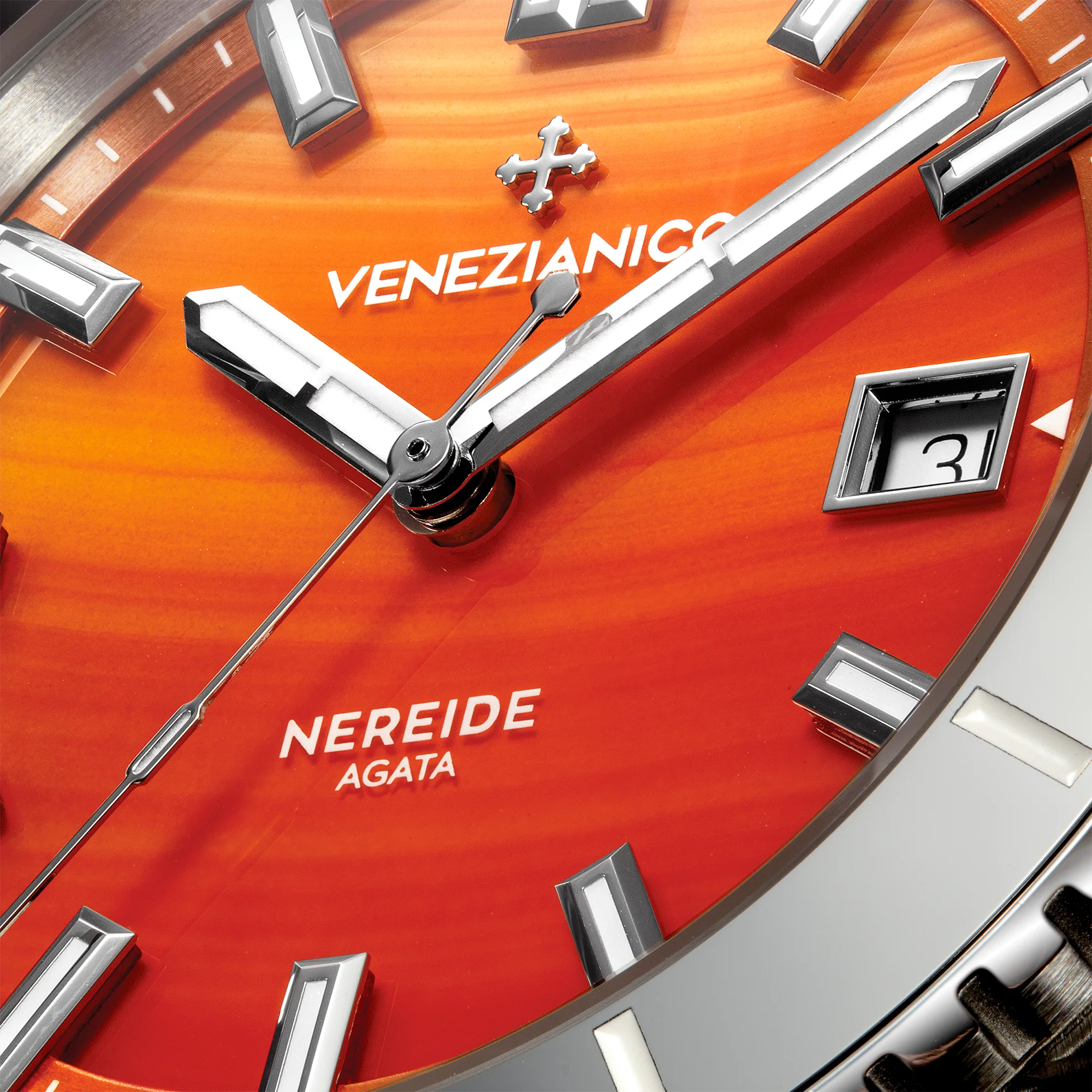 Nereide Agata emerges directly from the depths of the earth. This particular model stands out for its agate dial, a semiprecious stone that forms within volcanic rocks. As lava cools, cavities can form, providing the perfect environment for agate to develop through mineral deposition.
